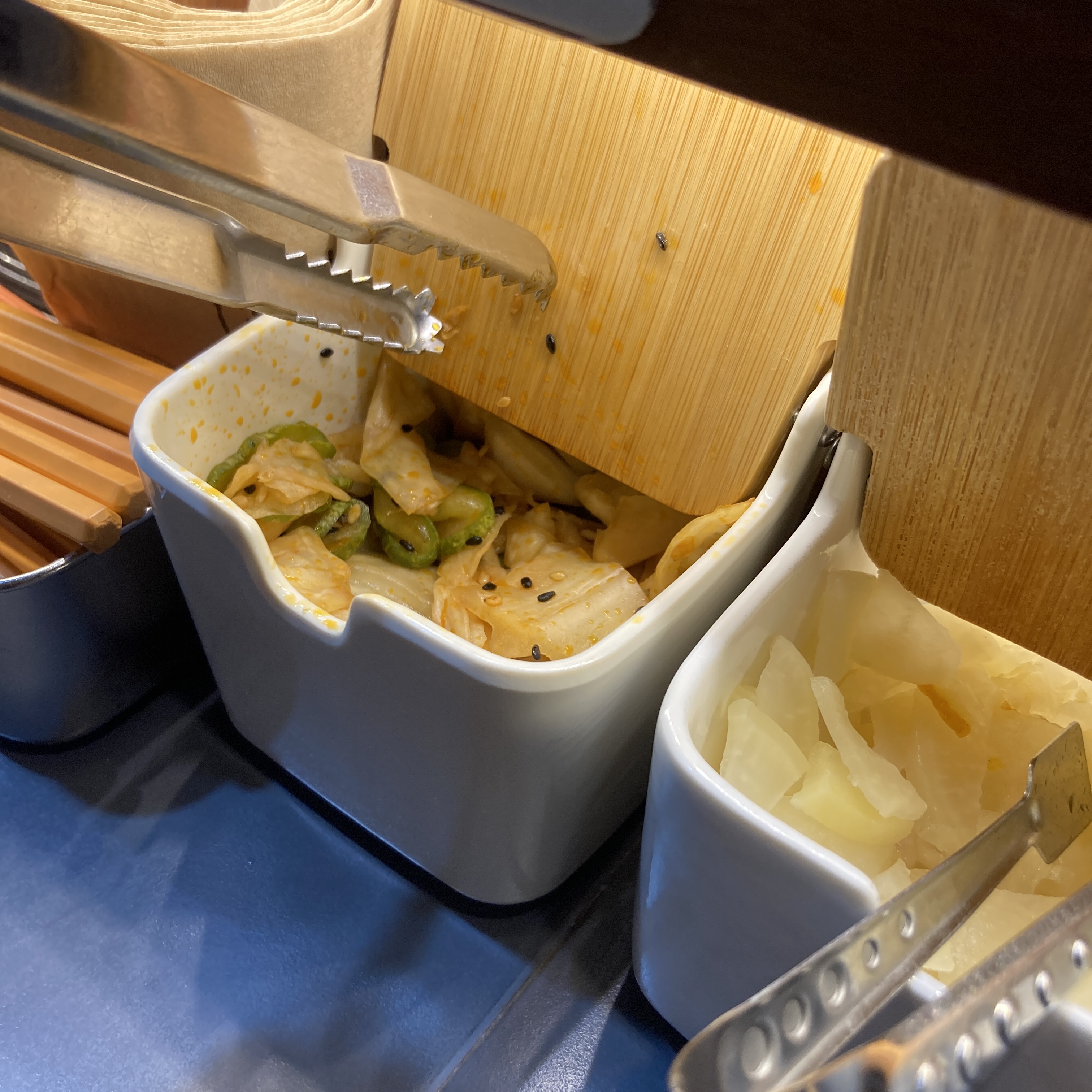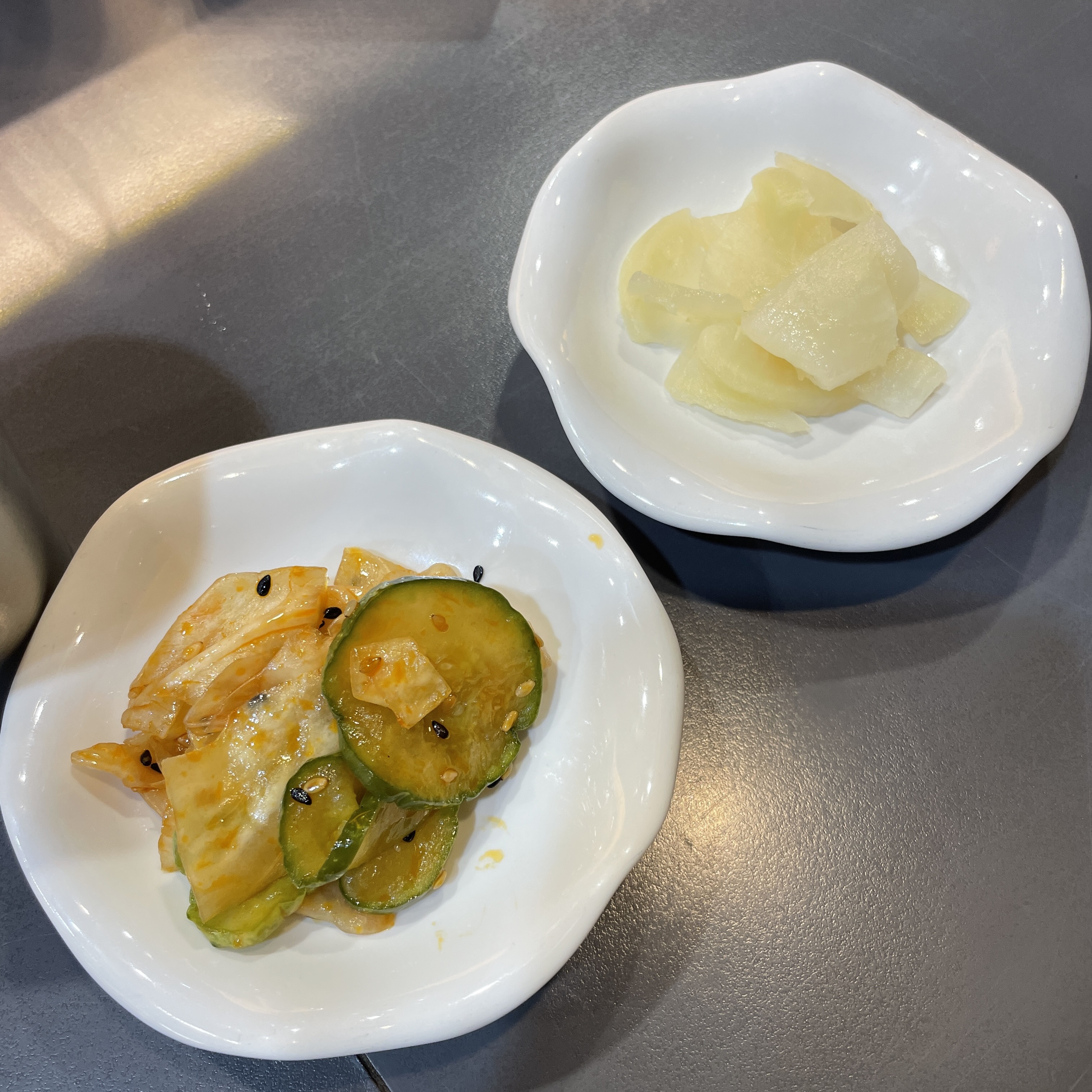 오이, 배추, 깨 등이 좀 보이는 사이드는 느끼함을 잡아주기 위해 준비한 것 같군요.
