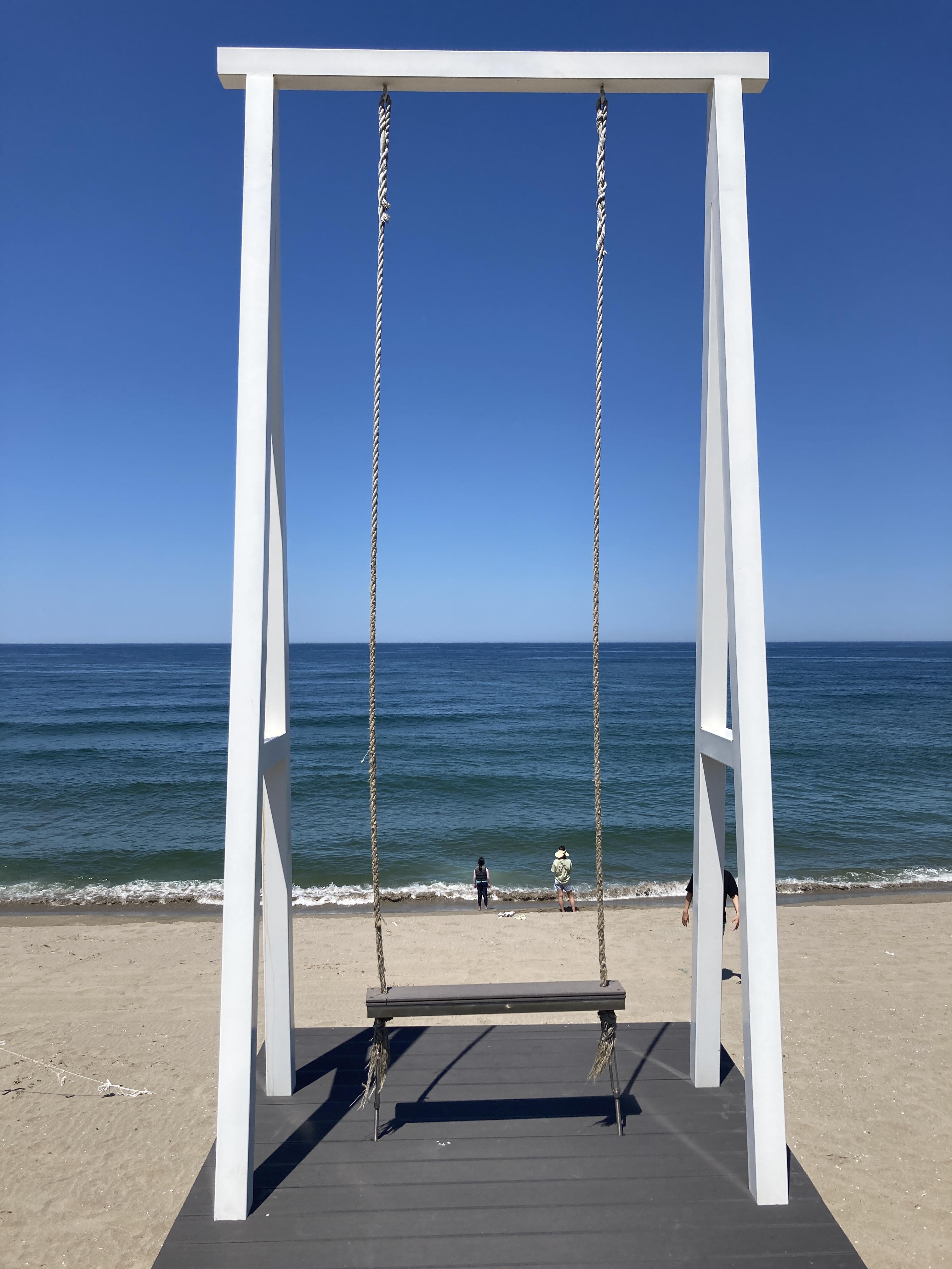 덕산해변에는 하얀색 기둥으로된 큰 그네가 있다.