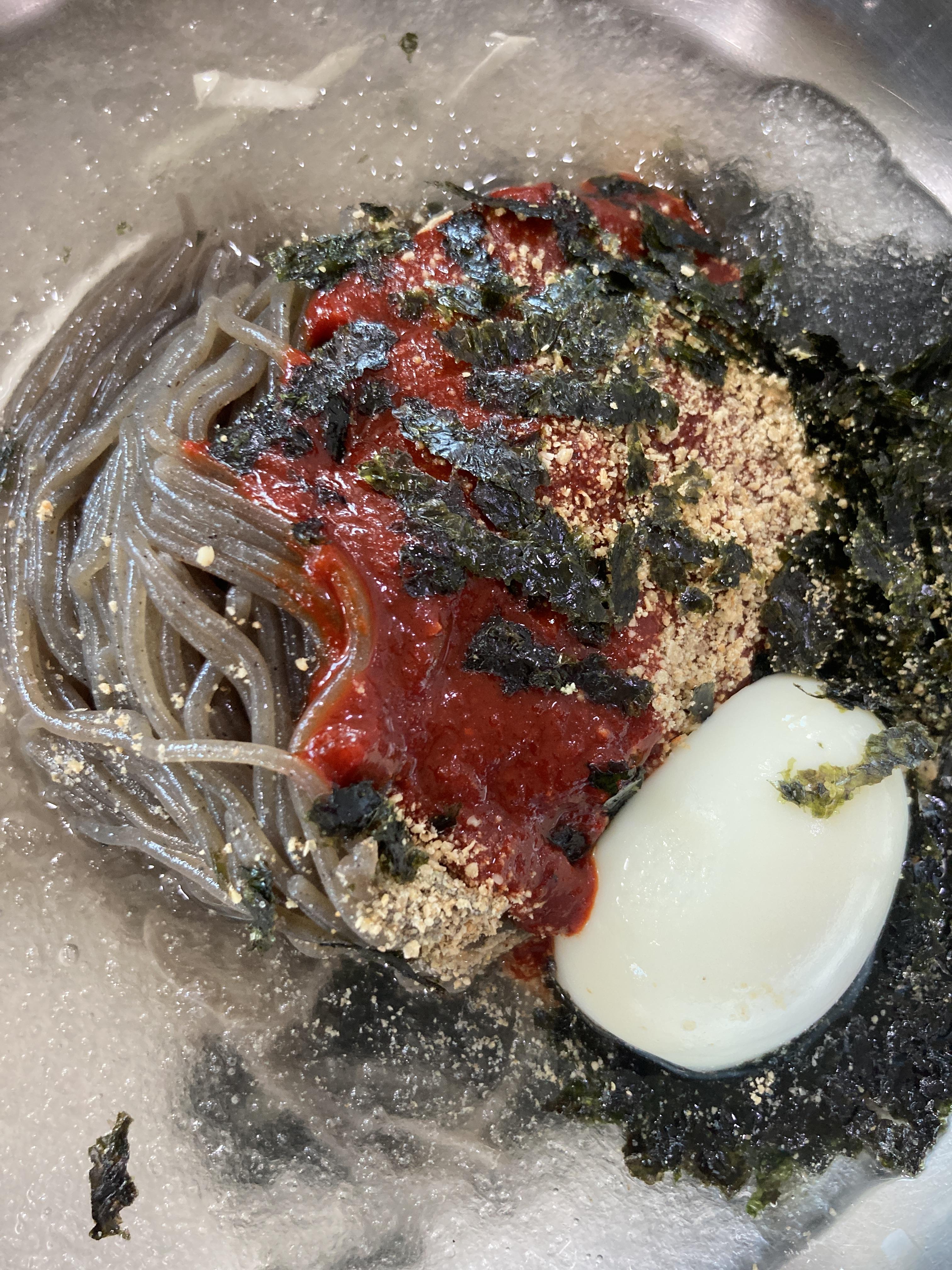 일단 빨간 양념장 그리고 김가루과 깨가루, 메밀면, 달걀~