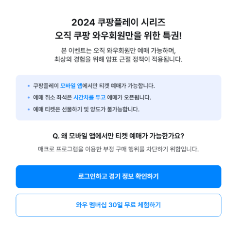 쿠팡플레이 시리즈는 오직 쿠팡 와우회원만 티켓을 구매할 수 있도록 하고 있습니다!